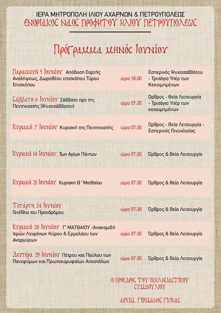 Πρόγραμμα ακολουθιών Ιουνίου ενορίας Προφ. Ηλιού Πετρ.