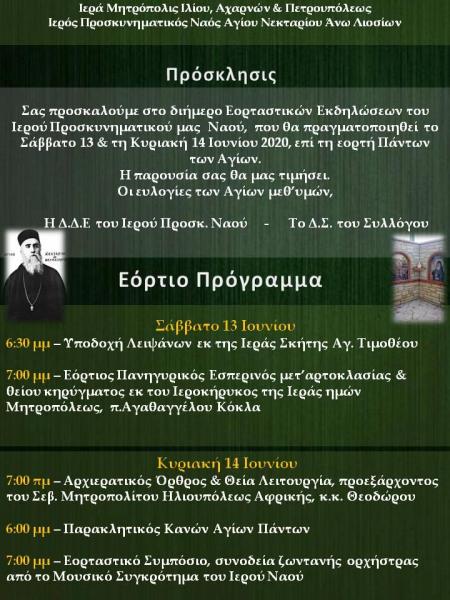 Σας προσκαλούμε στο διήμερο εορταστικών εκδηλώσεων του Ιερού Προσκυνηματικού Ναού Αγίου Νεκταρίου Άνω Λιοσίων, που θα πραγματοποιηθεί το Σάββατο 13 και την Κυριακή 14 Ιουνίου 2020, επί τη εορτή πάντων των Αγίων.