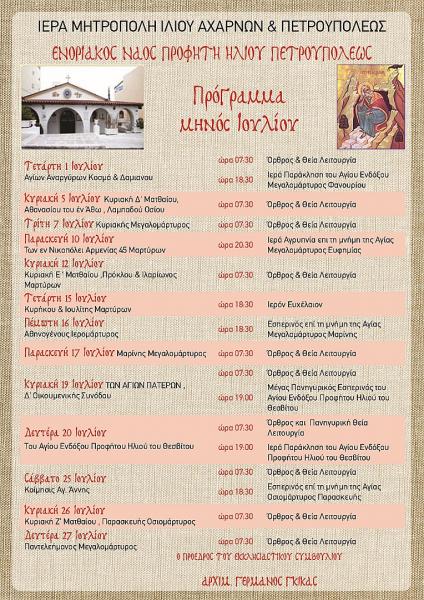 Πρόγραμμα ακολουθιών Ιουλίου ενορίας Προφ. Ηλιού Πετρ.