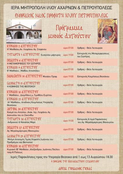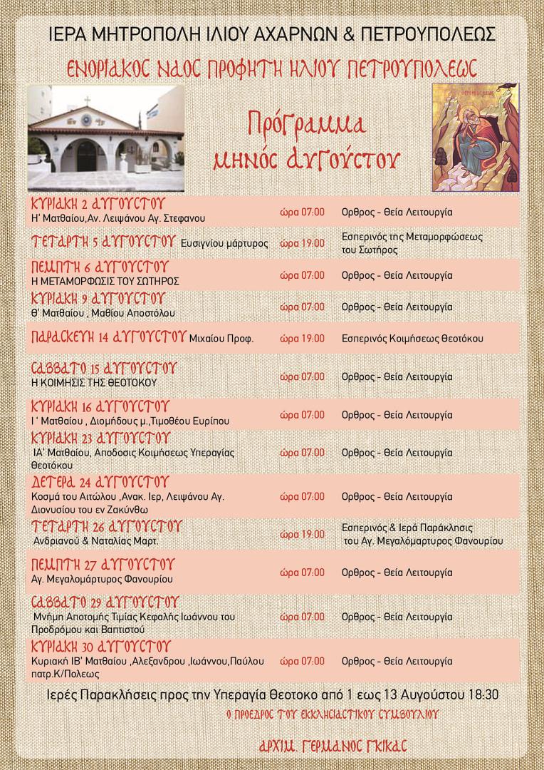 Δείτε το πρόγραμμα ακολουθιών για το μήνα Αύγουστο, στον Ιερό Ναό Προφήτου Ηλιού Πετρουπόλεως.