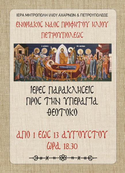 Οι παρακλήσεις στην Υπεραγία Θεοτόκο (2-13/8), θα ξεκινούν κάθε απόγευμα στις 18:30.