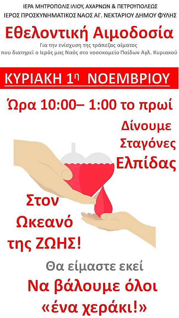 Εθελοντική αιμοδοσία θα πραγματοποιηθεί στον Ιερό Προσκυνηματικό Ναό Αγίου Νεκταρίου Άνω Λιοσίων την Κυριακή 1η Νοεμβρίου 2020, από ώρα 10 το πρωί, έως 1 το μεσημέρι.