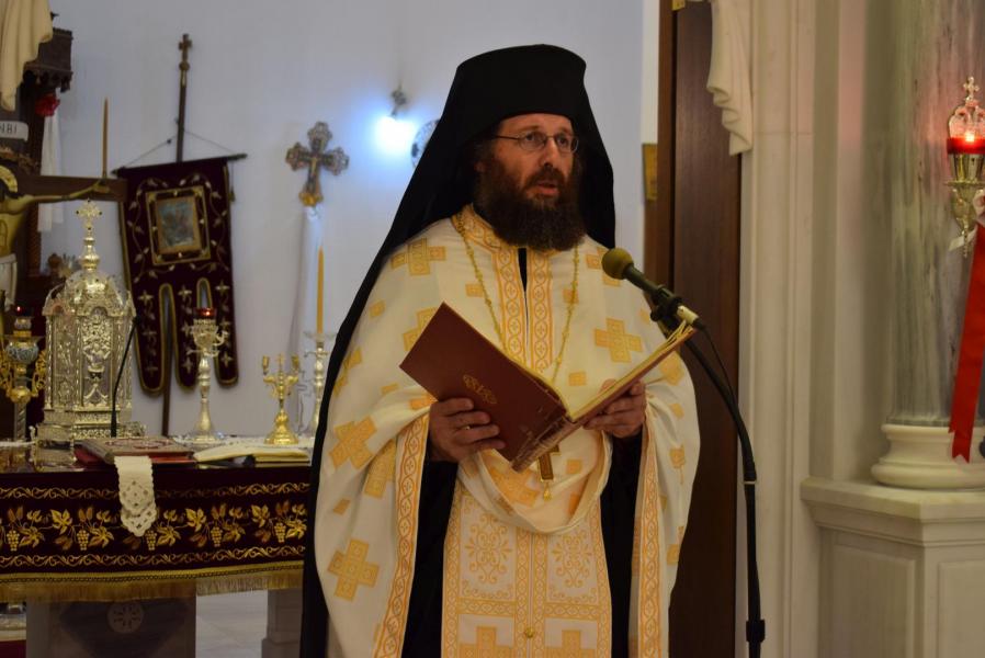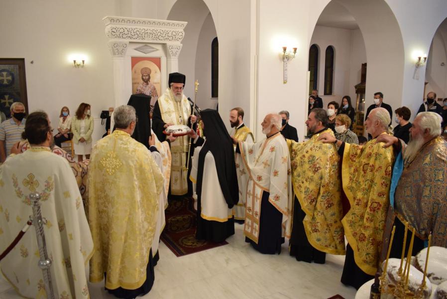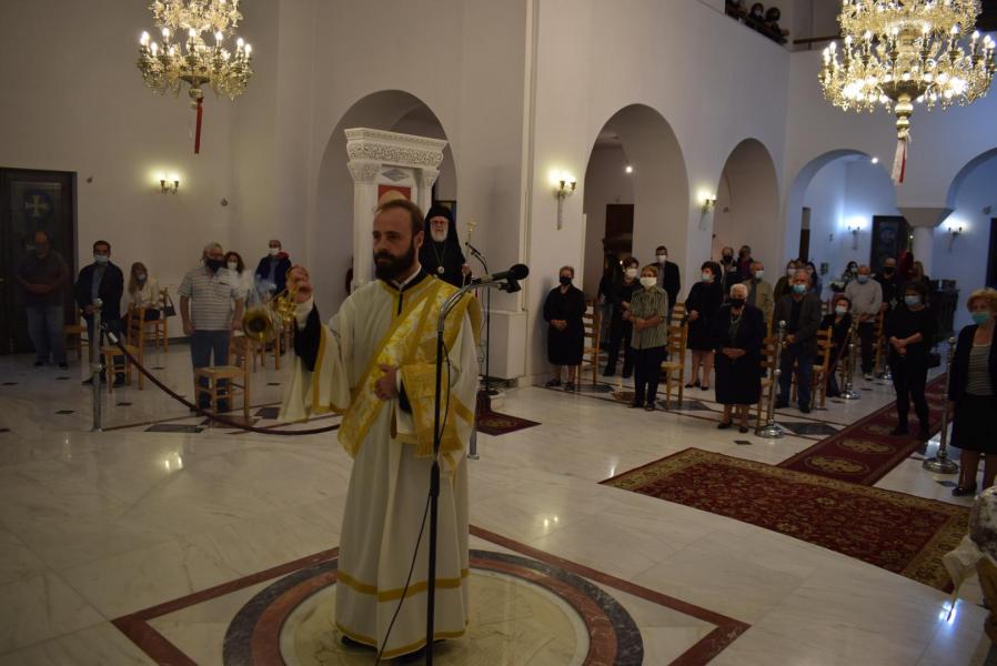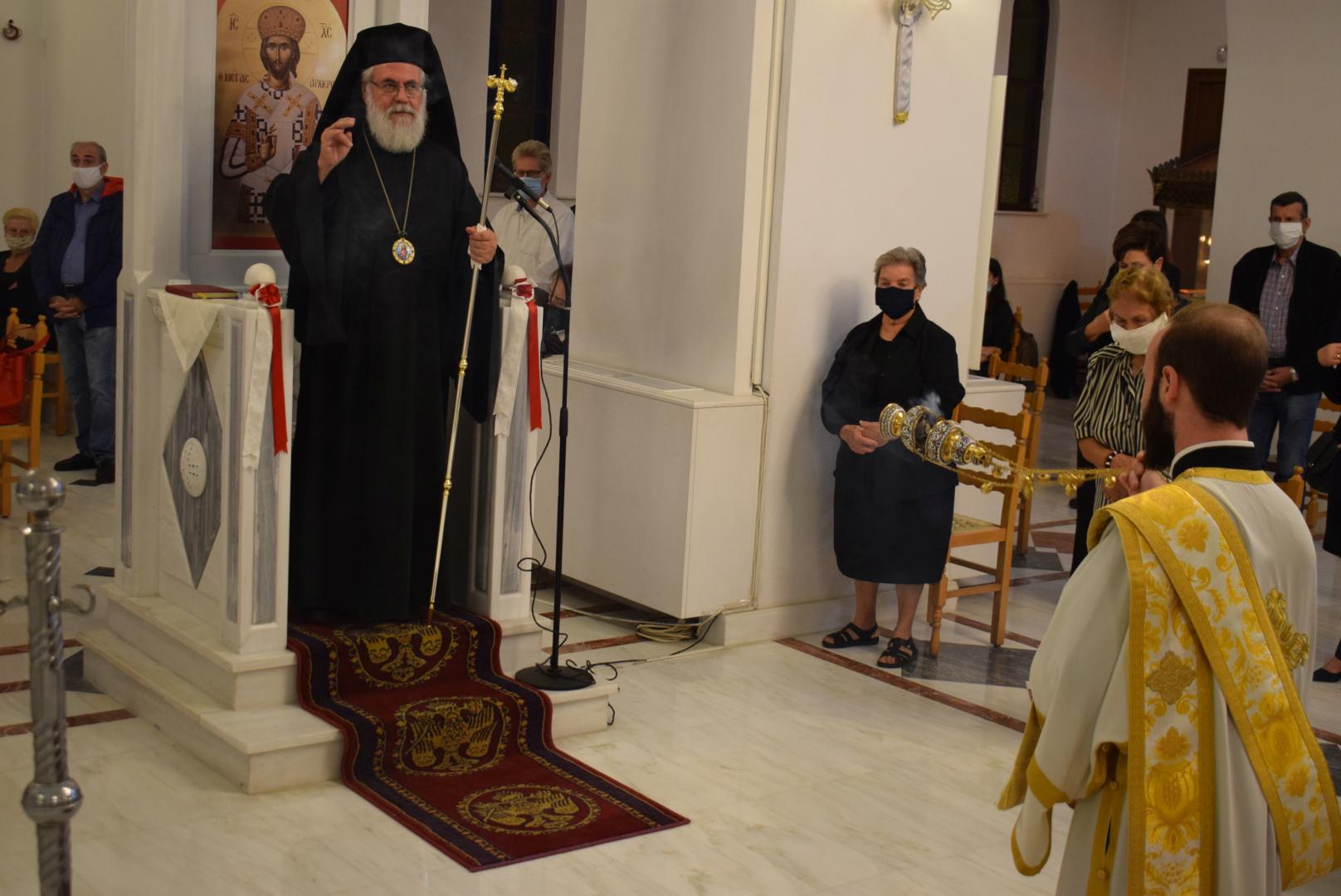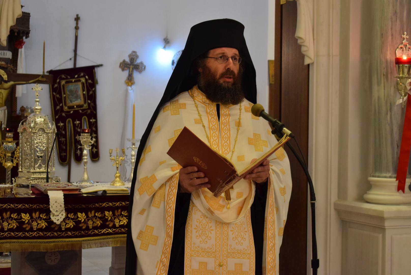 Στον πανηγυρικό Εσπερινό χοροστάτησε ο Σεβασμιώτατος Μητροπολίτης Ιλίου κ. Αθηναγόρας, ο οποίος μίλησε περί του Αγίου, λαμβάνοντας αφορμή από τους στίχους του δοξαστικού «Χαίροις ὁ τὸν χιτῶνα τῆς ἀσεβείας διαρρήξας, διὰ τῆς πίστεως - Χαίροις, ὁ λογχευθέντων τῶν μελῶν, τὸ μακάριον πάθος πνευματικῶς ἡμῖν ἀναζωγραφήσας τοῦ Χριστοῦ». Η λέξη πίστη στην γλώσσα της εποχής συγγραφής του τροπαρίου σημαίνει εμπιστοσύνη, την εμπιστοσύνη που έδειξε ο Άγιος στον Χριστό, έναντι της εμπιστοσύνης στον Ρωμαίο Αυτοκράτορα. Ο Άγιος γνώριζε πως όλα τα μαρτύρια δεν μπορούσαν να υπερνικήσουν την αγάπη του για τον Χριστό. Κι έτσι ο Άγιος «ζωγράφισε» τον τρόπο του μαρτυρίου του επάνω στην εικόνα του Πάθους του Χριστού, και ο Άγιος «αντέγραψε» με το μαρτύριό του τη μοναδική και ανεπανάληπτη θυσία του Χριστού.