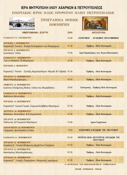 Πρόγραμμα ακολουθιών Νοεμβρίου 2020 ενορίας Προφ. Ηλία Πετρ.