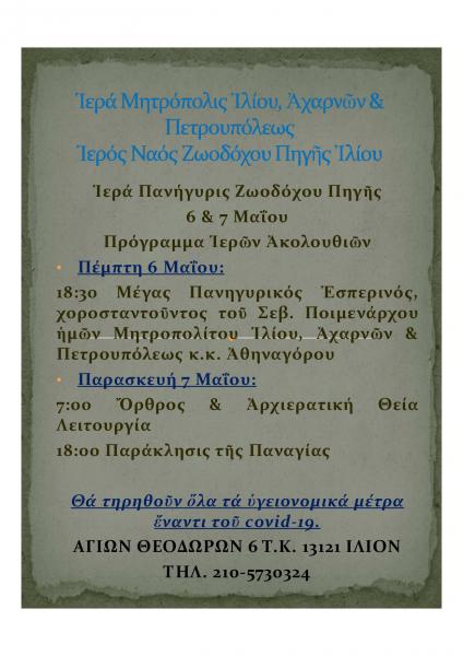 Την Παρασκευή της Διακαινησίμου, 7 Μαΐου 2021, εορτάζει η ενορία της Ζωοδόχου Πηγής Ιλίου.