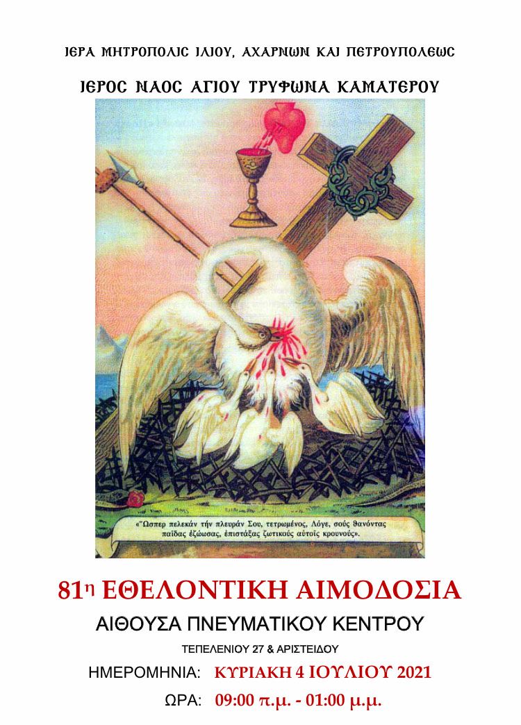 O Ι. Ν. Αγίου Τρύφωνος Καματερού διοργανώνει την Κυριακή 4 Ιουλίου 2021, από τις 9:00 π.μ. έως τις 1:00 μ.μ., την 81η εθελοντική αιμοδοσία στο Πνευματικό κέντρο του Ι. Ν. Αγίου Τρύφωνος Καματερού, Τεπελενίου και Αριστείδου γωνία.