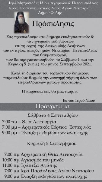 Σας προσκαλούμε στο διήμερο εκκλησιαστικών και πανηγυρικών εκδηλώσεων επί τη εορτή της Ανακομιδής των Λειψάνων του Αγίου Νεκταρίου Πενταπόλεως, που θα πραγματοποιηθούν στις 4 και 5 Σεπτεμβρίου 2021.