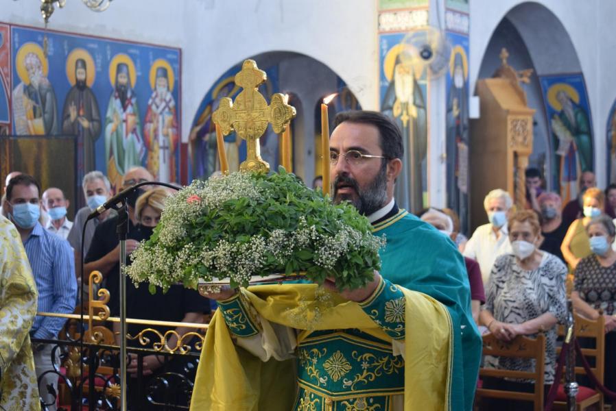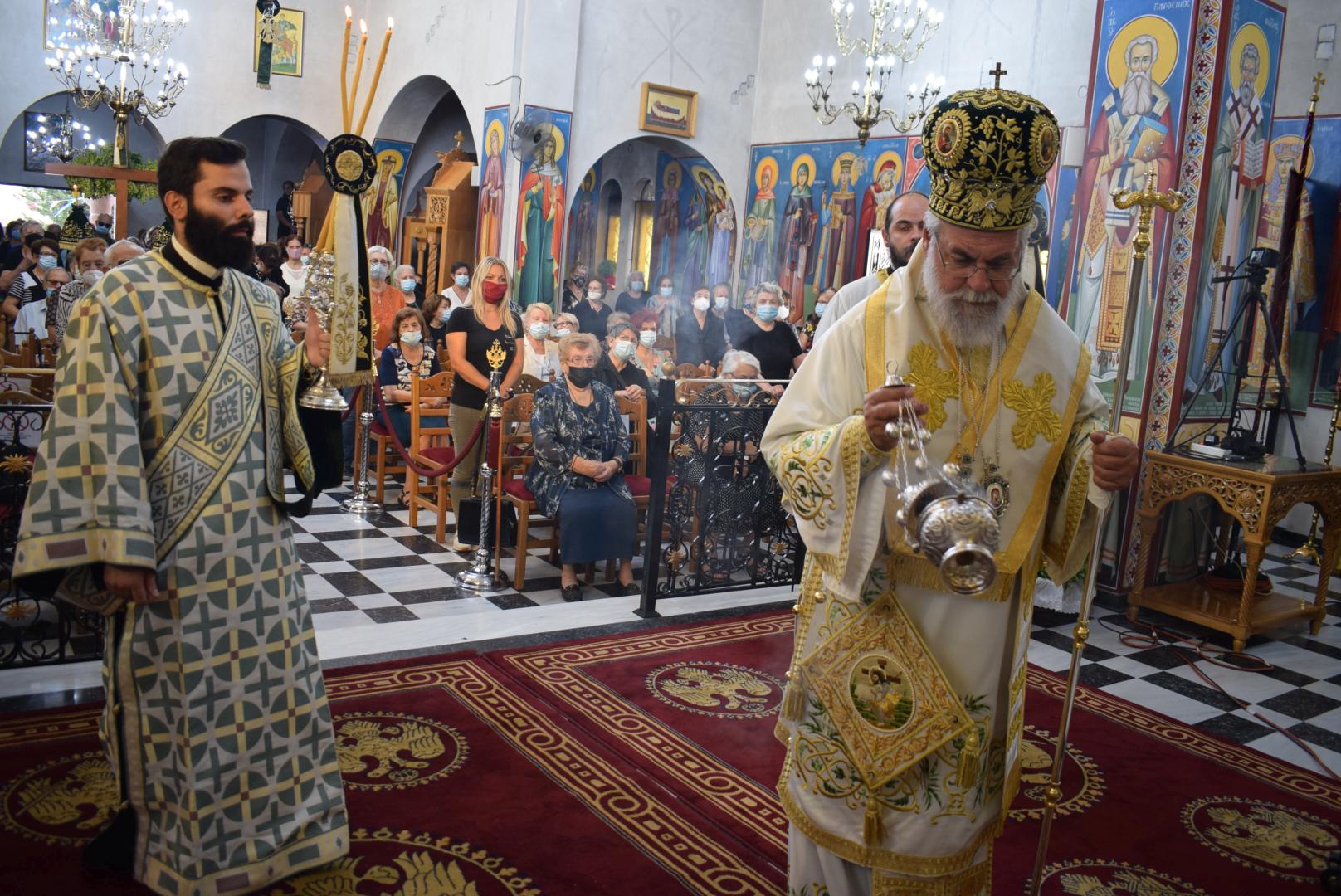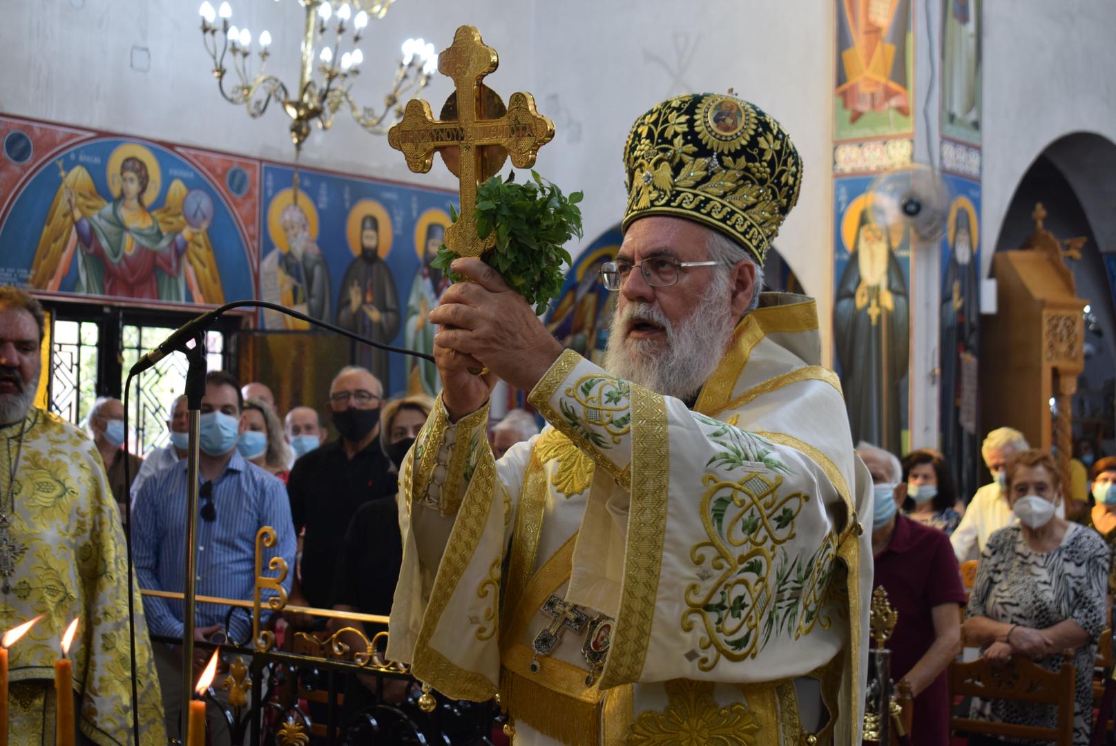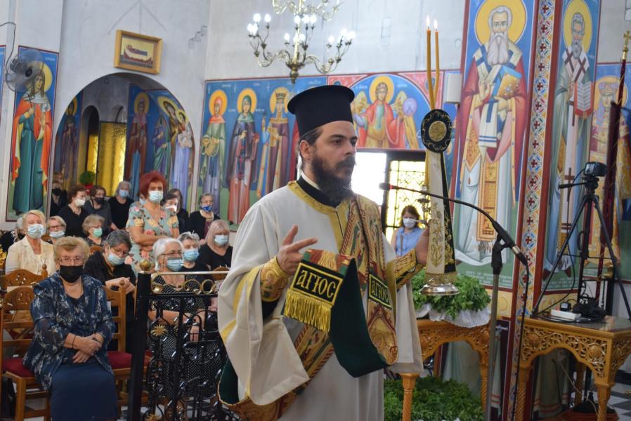 Στην ομιλία του ο Σεβασμιώτατος αναφέρθηκε στην προσκύνηση του Τιμίου Σταυρού και στην ερώτηση που πρέπει να θέσουμε στον εαυτό μας, ως προς το τι σημαίνει ο Τίμιος Σταυρός στη ζωή μας. Ξεκινώντας από το τροπάριο «Ὁ διὰ βρώσεως τοῦ ξύλου, τῷ γένει προσγενόμενος θάνατος, διὰ Σταυροῦ κατήργηται σήμερον», ανέδειξε τη συσχέτιση του ξύλου (=δέντρου) από το οποίο έφαγαν οι Πρωτόπλαστοι και του ξύλου του Τιμίου Σταυρού. Διά του καρπού του ενός ξύλου επήλθε ο θάνατος στη ζωή του ανθρώπου, ενώ διά του ξύλου του Σταυρού, καταργήθηκε ο θάνατος. Η τοποθέτηση του Τιμίου Σταυρού στο κέντρο του ναού μάς δείχνει την ελπίδα! Το ξύλο του Σταυρού είναι εκείνο το δέντρο, που από τη γεύση του «καρπού» του θα νικήσουμε τον θάνατο. Επάνω στον Σταυρό βρίσκεται «κρεμαμένη η ζωή ημών». Ειδικά σε δύσκολες περιόδους, ασθένειας και πανδημίας, είναι εμφανές ότι μόνο ο Εσταυρωμένος Χριστός είναι εκείνος που δίνει την ελπίδα και το νόημα και τη λύτρωση, γιατί με τον θάνατό Του και την Ανάστασή Του, άνοιξε το δρόμο μας προς τη Ζωή.