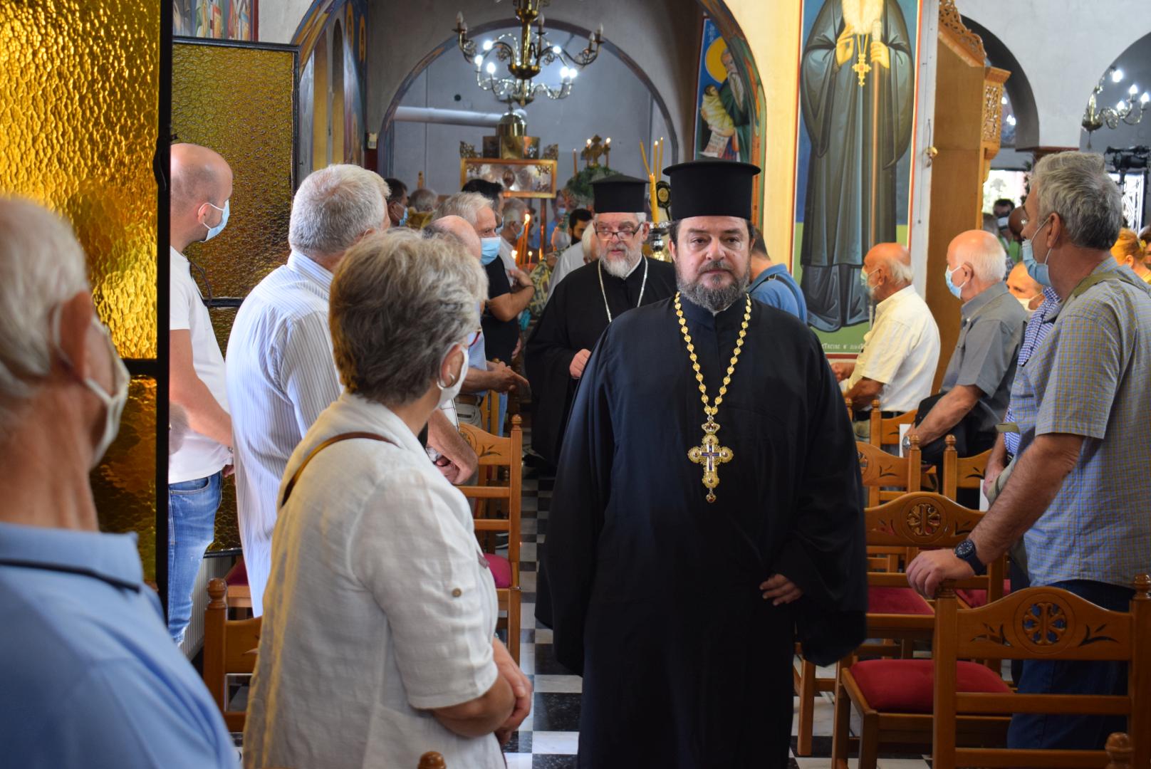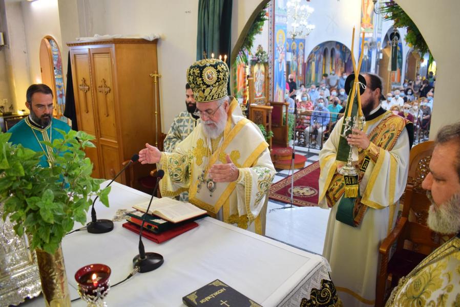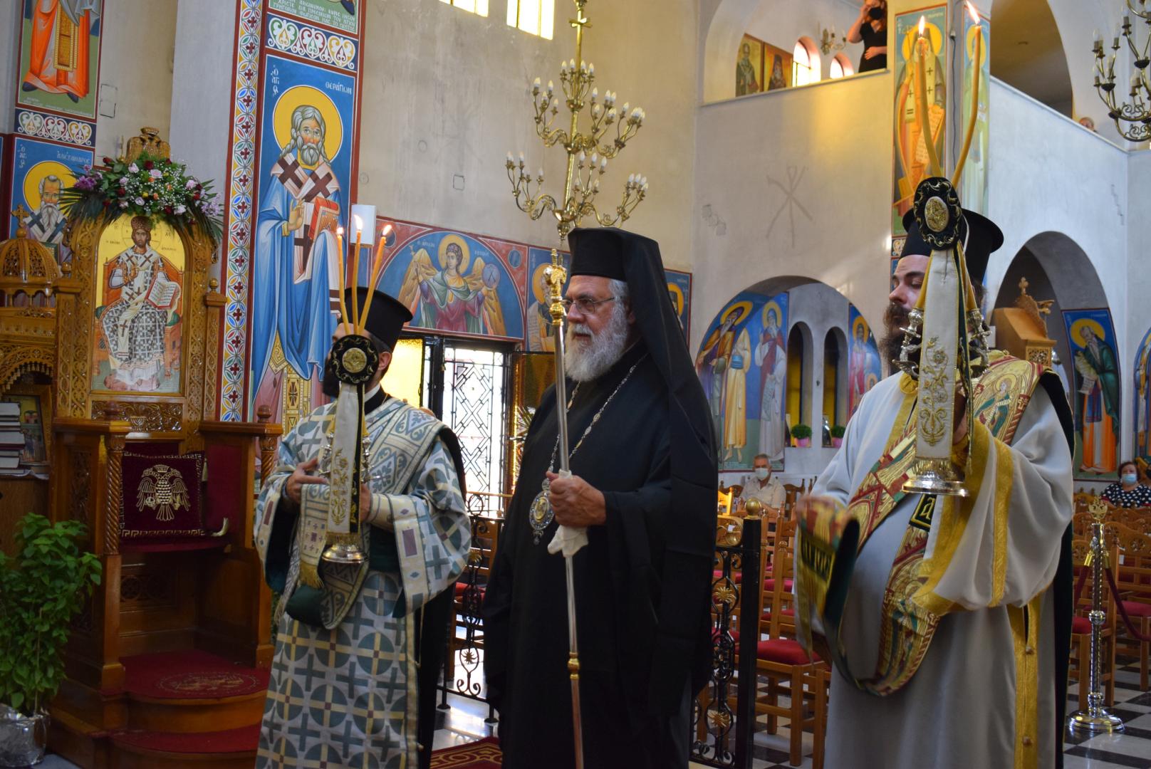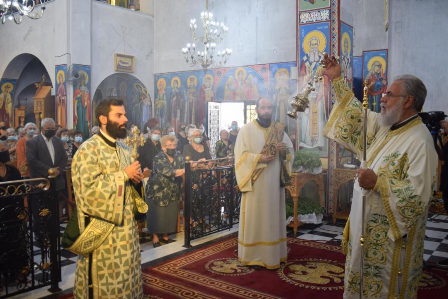 Στην ομιλία του ο Σεβασμιώτατος αναφέρθηκε στην προσκύνηση του Τιμίου Σταυρού και στην ερώτηση που πρέπει να θέσουμε στον εαυτό μας, ως προς το τι σημαίνει ο Τίμιος Σταυρός στη ζωή μας. Ξεκινώντας από το τροπάριο «Ὁ διὰ βρώσεως τοῦ ξύλου, τῷ γένει προσγενόμενος θάνατος, διὰ Σταυροῦ κατήργηται σήμερον», ανέδειξε τη συσχέτιση του ξύλου (=δέντρου) από το οποίο έφαγαν οι Πρωτόπλαστοι και του ξύλου του Τιμίου Σταυρού. Διά του καρπού του ενός ξύλου επήλθε ο θάνατος στη ζωή του ανθρώπου, ενώ διά του ξύλου του Σταυρού, καταργήθηκε ο θάνατος. Η τοποθέτηση του Τιμίου Σταυρού στο κέντρο του ναού μάς δείχνει την ελπίδα! Το ξύλο του Σταυρού είναι εκείνο το δέντρο, που από τη γεύση του «καρπού» του θα νικήσουμε τον θάνατο. Επάνω στον Σταυρό βρίσκεται «κρεμαμένη η ζωή ημών». Ειδικά σε δύσκολες περιόδους, ασθένειας και πανδημίας, είναι εμφανές ότι μόνο ο Εσταυρωμένος Χριστός είναι εκείνος που δίνει την ελπίδα και το νόημα και τη λύτρωση, γιατί με τον θάνατό Του και την Ανάστασή Του, άνοιξε το δρόμο μας προς τη Ζωή.