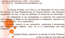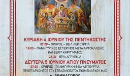 Φέρεται εις γνώσιν του χριστεπωνύμου ποιμνίου της καθ' ημάς Ιεράς Μητροπόλεως, ότι την Κυριακή των Αγίων Πάντων, 11 Ιουνίου 2023, θα τελεστεί Αρχιερατική Θεία Λειτουργία, ιερουργούντος του Σεβασμιωτάτου Μητροπολίοτυ Ιλίου κ. Αθηναγόρου, με τη συμμετοχή ιερέων και διακόνων στο Ιερό Παρεκκλήσιο Μεταμορφώσεως του Σωτήρος (παρεκκλήσιο του Ι.Ν. Αγίου Γεωργίου Αχαρνών, Λεωφόρος Καραμανλή και Φιλοκτήτου 4, Αχαρνές).