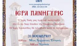 Ο Ιερός Ναός Κοιμήσεως Θεοτόκου Παλατιανής Ιλίου τιμά και πανηγυρίζει την εν τω Ναώ Είσοδον της Υπεραγίας Θεοτόκου. Οι Ιερές Ακολουθίες θα τελεσθούν κατά το πρόγραμμα: