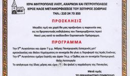 Μεγάλη τιμή και χαρά θα προξενήσει η παρουσία σας εις τας θρησκευτικάς εκδηλώσεις του πανηγυρίζοντος Ιερού Ναού Μεταμορφώσεως του Σωτήρος Ζωφριάς, κατά το ακόλουθον εορταστικόν πρόγραμμα: