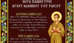 Την ερχόμενη Δευτέρα και Τρίτη, 26 και 27 Μαϊου 2025, πανηγυρίζει το Ιερό Παρεκκλήσιο του Αγίου Ιωάννου του Ρώσου, που βρίσκεται στον κήπο του Ιερού Ναού Αγίου Γεωργίου Ζωφριάς. Καλούνται οι ευσεβείς και φιλέορτοι Χριστιανοί να τιμήσουν τον Όσιο και να προσκυνήσουν απότμημα από τα Ιερά του Άμφια το οποίο δώρησε στον Σεβασμιώτατο Ποιμενάρχη μας ο Σεβασμιώτατος Μητροπολίτης Χαλκίδος κ. Χρυσόστομος.