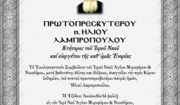 Την Πέμπτη 27 Μαρτίου 2025 τελέστηκε η εξόδιος ακολουθία του μακαριστού πατρός Ηλία Λαμπρόπουλου, στον Ιερό Ναό Αγίων Μυροφόρων και Νικοδήμου, στου οποίου την ανοικοδόμηση υπήρξε ο εμπνευστής και ακούραστος εργάτης και τον οποίο υπηρέτησε κατόπιν επί πολλά χρόνια.