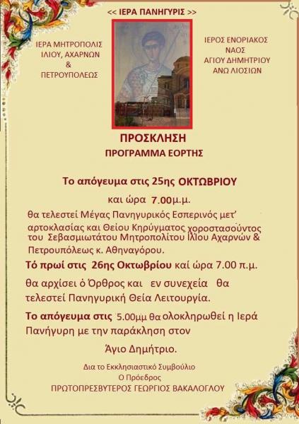 Πανηγυρίζει η ενορία Αγίου Δημητρίου Άνω Λιοσίων στις 25 και 26 Οκτωβρίου 2021.