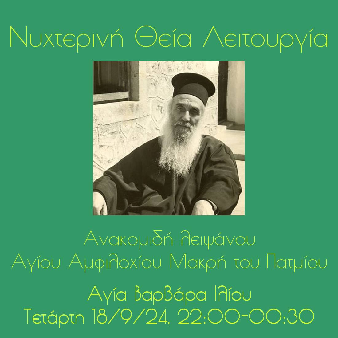 Νυχτερινή Θεία Λειτουργία με Όρθρο θα τελεστεί στην ενορία της Αγίας Βαρβάρας Ιλίου, την Τετάρτη 18 Σεπτεμβρίου 2024, από 22:00 έως 00:30 περίπου, επί τη ανακομιδή του τιμίου λειψάνου του Αγίου Αμφιλοχίου Μακρή του Πατμίου.