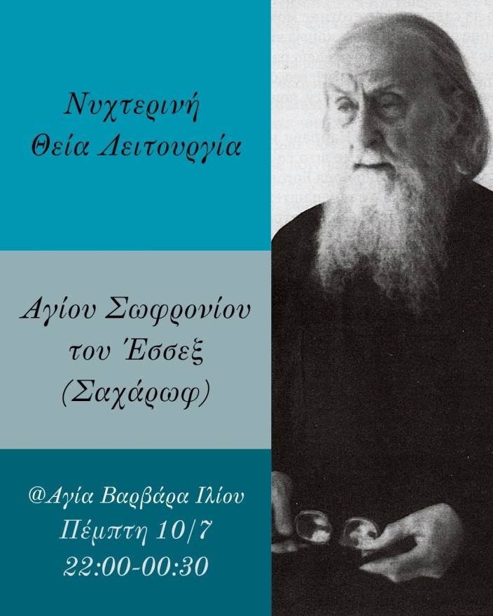 Νυχτερινή Θεία Λειτουργία θα τελεστεί την Πέμπτη 10 Ιουλίου 2025, από 22:00 έως 00:30, στον Ιερό Ναό Αγίας Βαρβάρας Ιλίου. Μνήμη του Οσίου και θεοφόρου πατρός ημών Σωφρονίου του Έσσεξ (Σαχάρωφ), που κοιμήθηκε στις 11/7/1993.