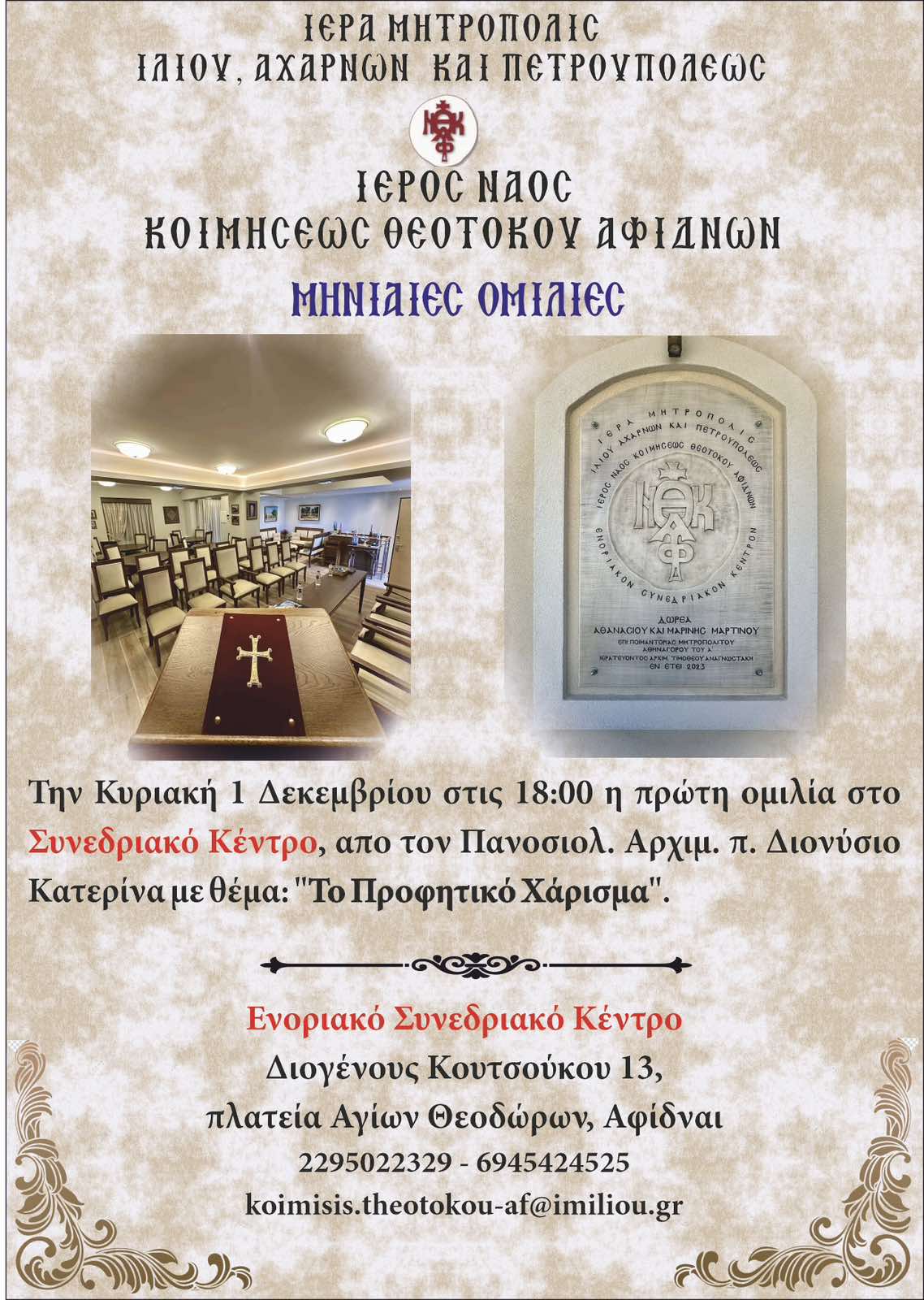 Την Κυριακή 1 Δεκεμβρίου 2024 στις 18:00 θα πραγματοποιηθεί η πρώτη ομιλία στο νέο συνεδριακό κέντρο των Αφιδνών, από τον Πανοσιολογιώτατο Αρχιμ. Διονύσιο Κατερίνα με θέμα «Το Προφητικό χάρισμα».