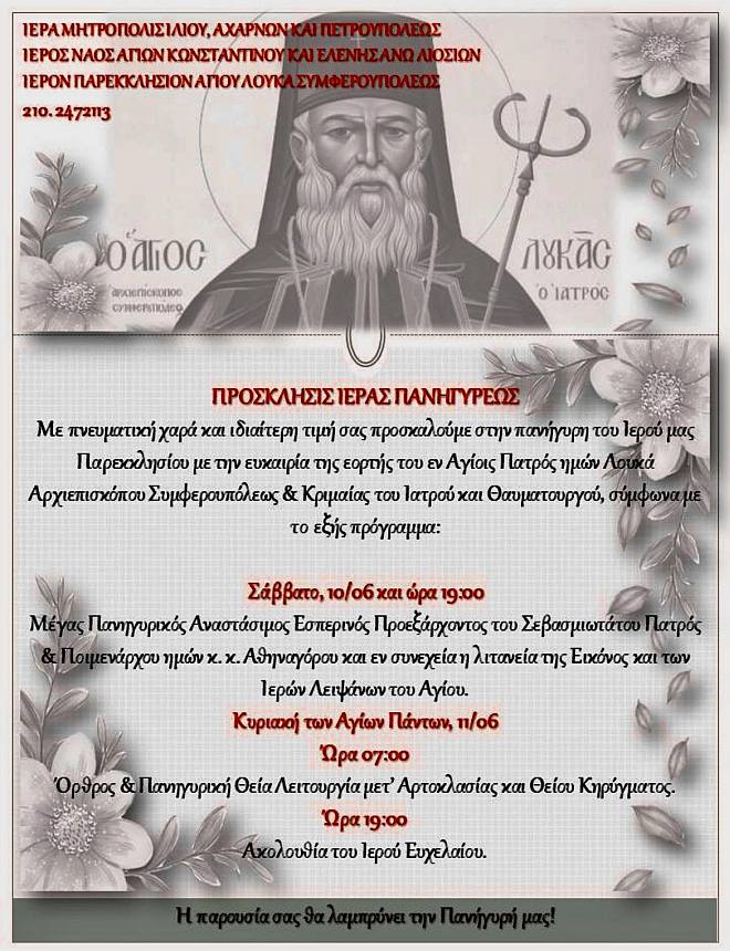 Με πνευματική χαρά και ιδιαίτερη τιμή σάς προσκαλούμε στην πανήγυρη του Ιερού Παρεκκλησίου του εν Αγίοις Πατρός ημών Λουκά, Αρχιεπισκόπου Συμφερουπόλεως και Κριμαίας, του ιατρού και θαυματουργού στα Άνω Λιόσια, σύμφωνα με το εξής πρόγραμμα: