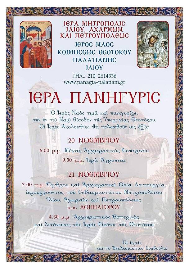 Ο Ιερός Ναός Κοιμήσεως της Θεοτόκου Παλατιανής Ιλίου τιμά και πανηγυρίζει την «ἐν τῷ Ναῷ Εἴσοδον» της Υπεραγίας Θεοτόκου.