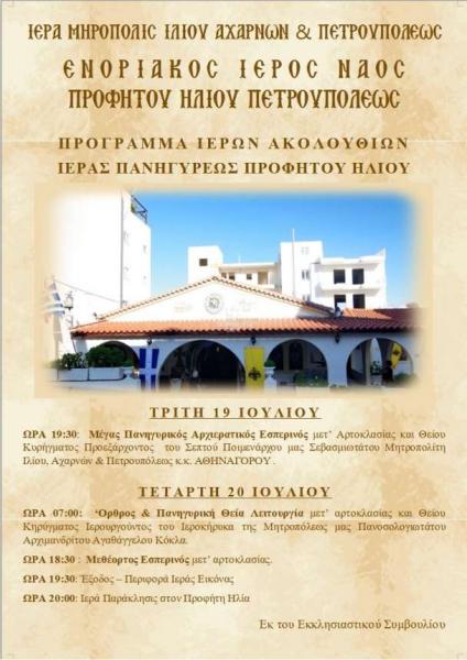 Πανηγυρίζει η ενορία του Προφήτη Ηλία Πετρουπόλεως, σύμφωνα με το ακόλουθο πρόγραμμα: