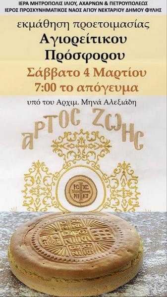 Καλούνται όσοι ενδιαφέρονται να μάθουν πως παρασκευάζεται το πρόσφορο, κατά την αγιορείτικη παράδοση, στον Ιερό Ναό Αγίου Νεκταρίου Άνω Λιοσίων, Δήμου Φυλής, το Σάββατο 4 Μαρτίου 2023 στις 19:00, στην παρουσίαση που θα κάνει ο εφημέριος του Ναού Αρχιμ. Μηνάς Αλεξιάδης.
