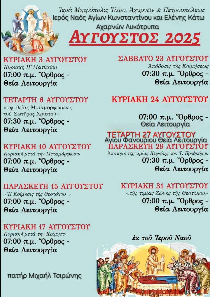 Δείτε το πρόγραμμα ακολουθιών για τον μήνα Αύγουστο 2025 στον Ιερό Ναό Αγίων Κωνσταντίνου και Ελένης Κάτω Αχαρνών.