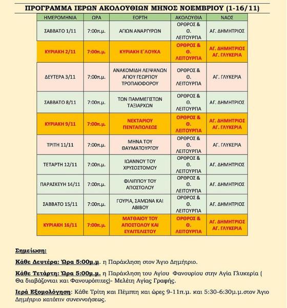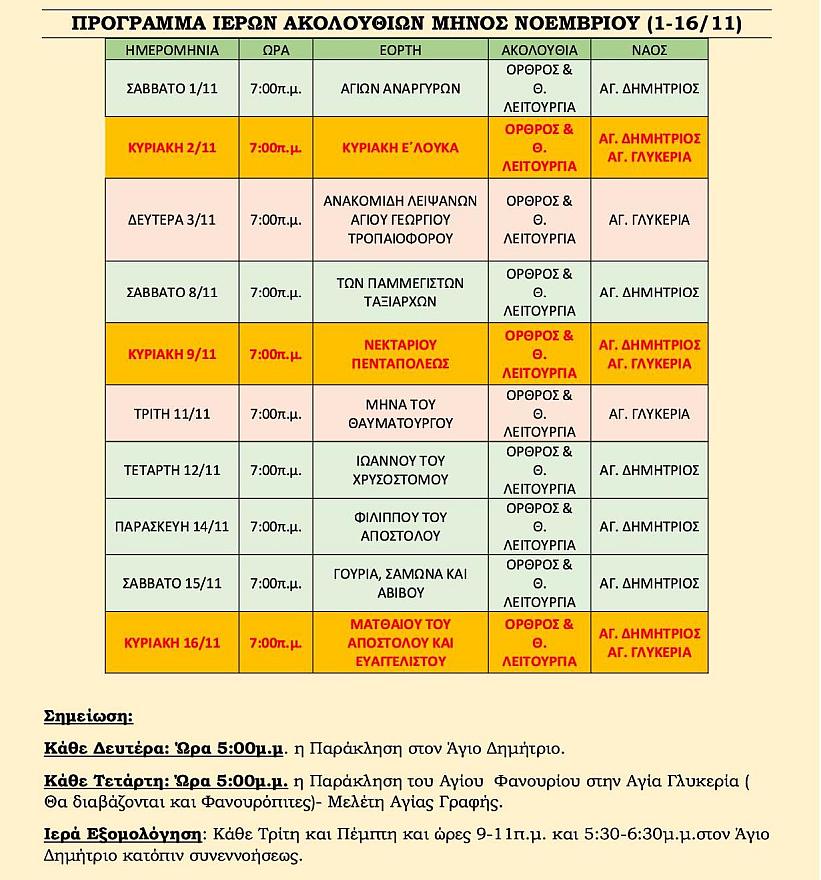 Δείτε το πρόγραμμα ακολουθιών του Α' δεκαπενθημέρου του Νοεμβρίου 2025, στην ενορία του Αγίου Δημητρίου Πετρουπόλεως.