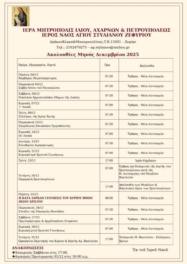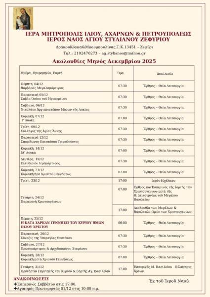 Πρόγραμμα ακολουθιών Δεκεμβρίου 2025 ενορίας Αγ. Στυλιανού Ζεφυρίου