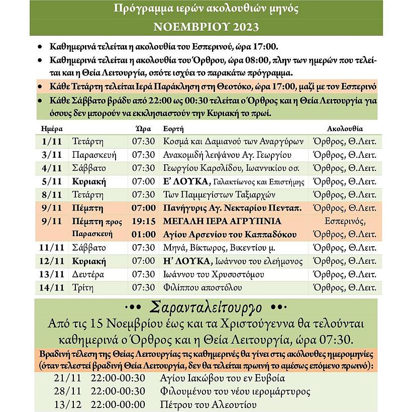 Πρόγραμμα ακολουθιών Νοεμβρίου 2023 ενορίας Αγίας Βαρβάρας Ιλίου