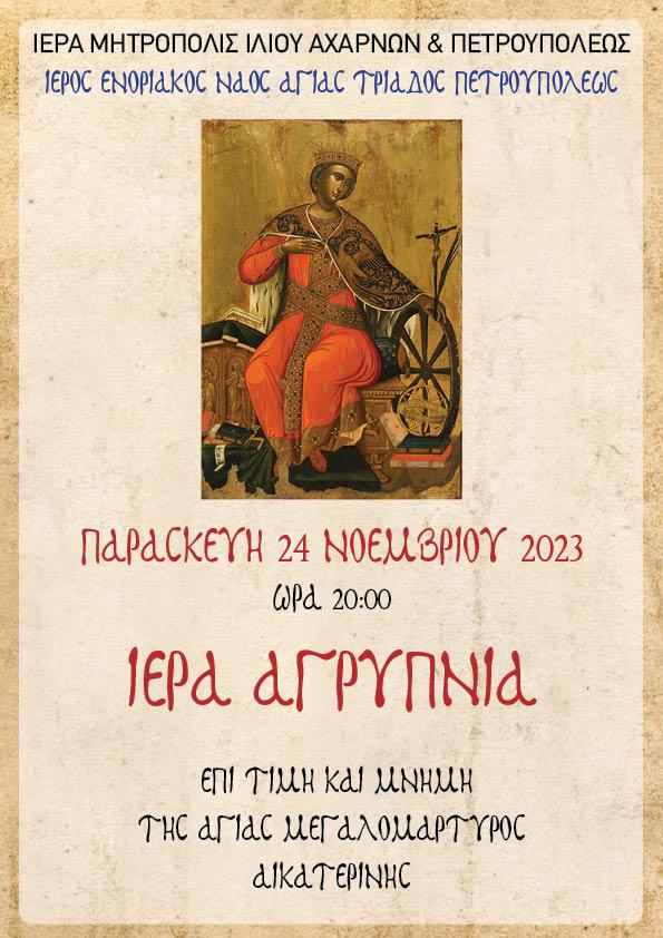 - Την Παρασκευή 24 Νοεμβρίου 2023, ώρα 20:00 μ.μ. η Ιερά Αγρυπνία επί τιμή και μνήμη, της Αγίας Μεγαλομάρτυρος Αικατερίνης.