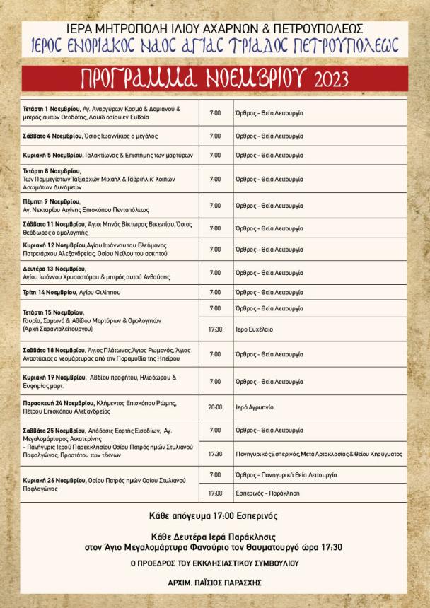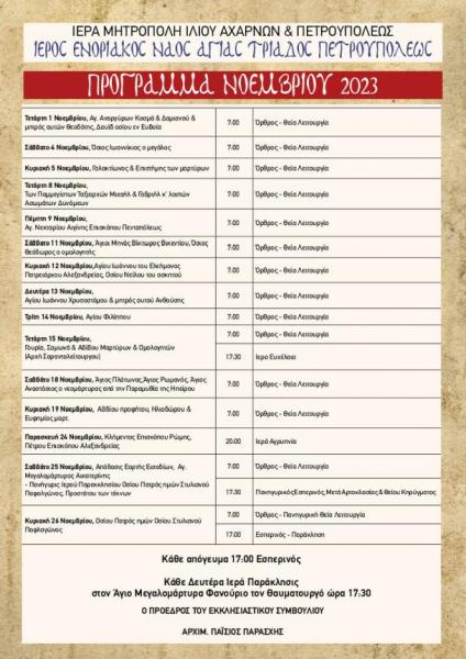 Πρόγραμμα ακολουθιών Νοεμβρίου 2023 ενορίας Αγίας Τριάδας Πετρ.