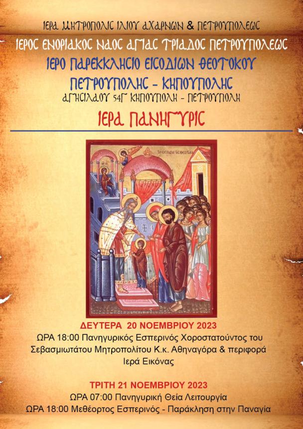 - Ιερά Πανήγυρις του Ιερού Παρεκκλησίου Εισοδίων της Θεοτόκου τη Δευτέρα 20 Νοεμβρίου και ώρα 18:00 ο Μέγας Πανηγυρικός Εσπερινός, χοροστατούντος του Σεβασμιωτάτου Μητροπολίτου μας κ. Αθηναγόρου και εν συνεχεία η Λιτάνευση της Ιεράς Εικόνος. Τρίτη 21 Νοεμβρίου ώρα 07:00 ο Όρθρος και η Πανηγυρική Θεία Λειτουργία, το απόγευμα και ώρα 18:00 ο Μεθέορτος Εσπερινός και η Ιερά Παράκλησις στην Παναγία μας.