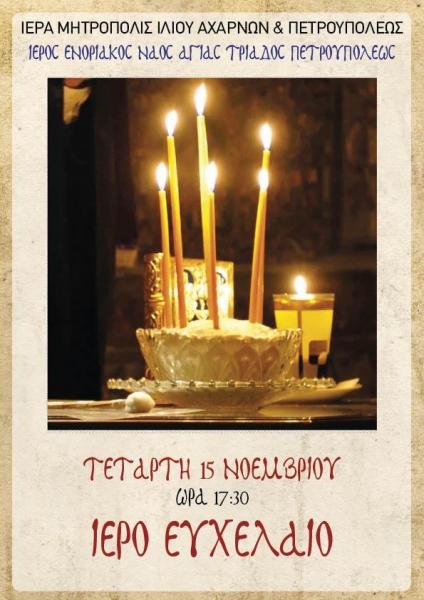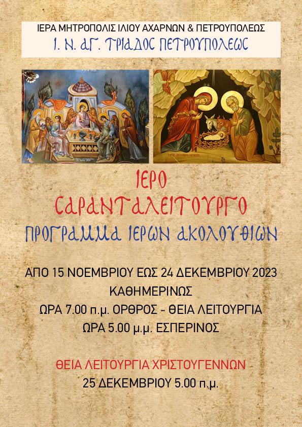 - Ιερό Σαρανταλείτουργο θα τελεστεί στην Ενορία Αγίας Τριάδος Πετρουπόλεως 15/11 - 24/12, καθημερινά ώρα 07:00 - 09:00, ο Όρθρος και η Θεία Λειτουργία.