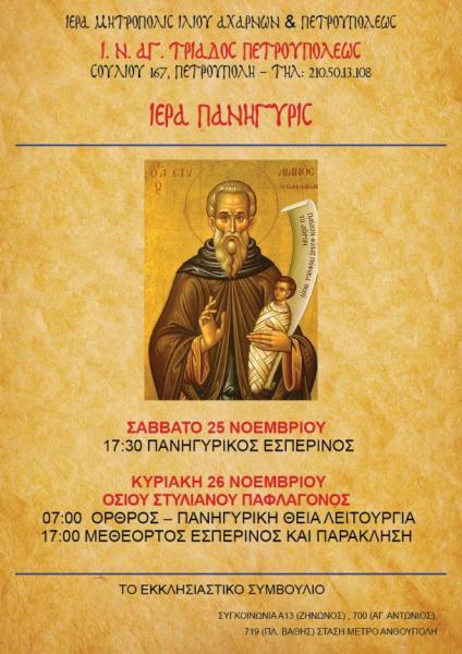 - Ιερά Πανήγυρις Ιερού Παρεκκλησίου Οσίου Στυλιανού Παφλαγόνος το Σάββατο 25 Νοεμβρίου και ώρα 17:30 ο Πανηγυρικός Εσπερινός μετ' αρτοκλασίας και θείου κηρύγματος. Κυριακή 26 Νοεμβρίου 2023 και ώρα 07:00 Όρθρος - Πανηγυρική Θεία Λειτουργία, ώρα 17:30 Εσπερινός, Ιερά Παράκλησις στον Όσιο Στυλιανό.