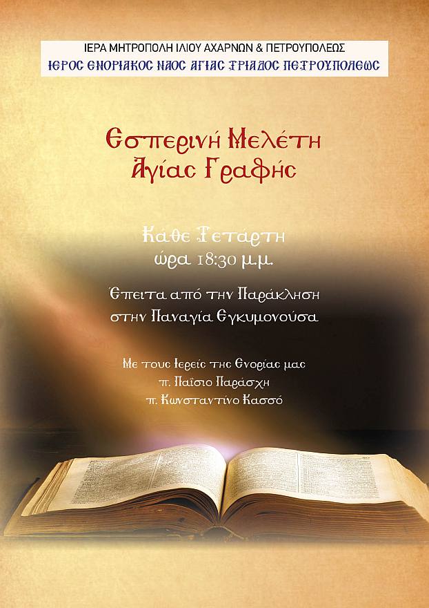 • Η Ιερά Παράκληση στην Παναγία Εγκυμονούσα και η μελέτη Αγίας Γραφής κάθε Τετάρτη ώρα 18:30.