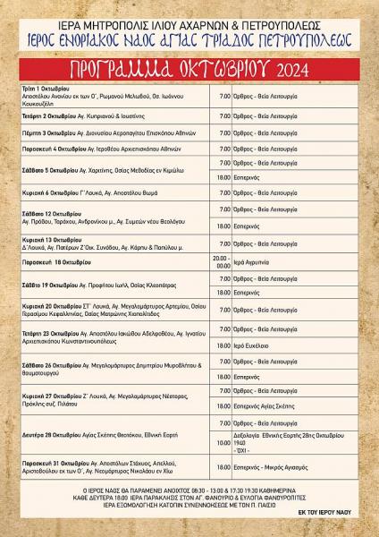 Πρόγραμμα ακολουθιών Οκτωβρίου 2024 ενορίας Αγ. Τριάδας Πετρ.