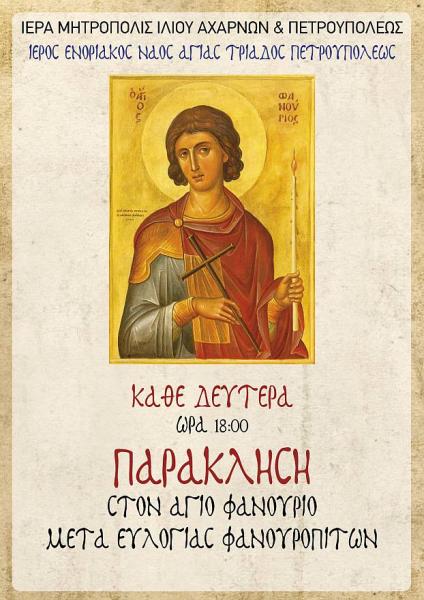 • Η Ιερά Παράκληση στον Άγιο Μεγαλομάρτυρα Φανούριο κάθε Δευτέρα ώρα 18:00, όπου θα ευλογούνται και οι φανουρόπιτες.