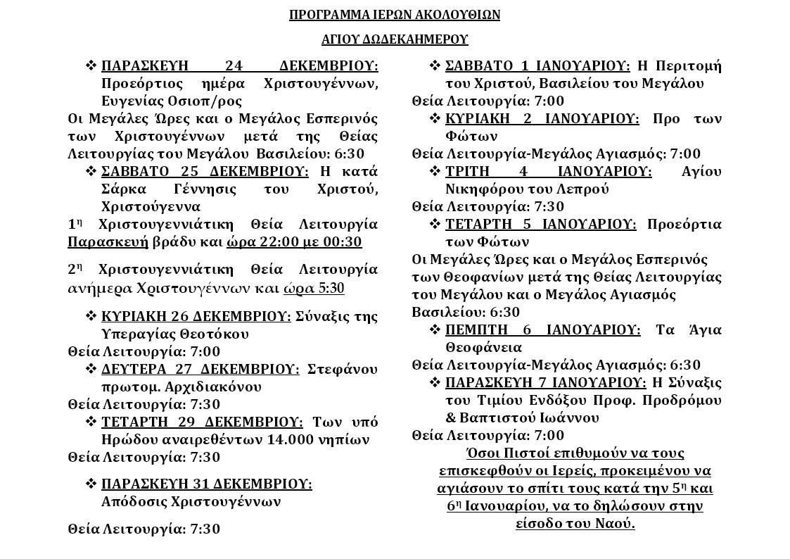 Δείτε το πρόγραμμα ακολουθιών για το Άγιο Δωδεκαήμερο 2021-2022, όπως θα τελεστούν στον Ιερό Ναό Αγίου Διονυσίου Ιλίου.