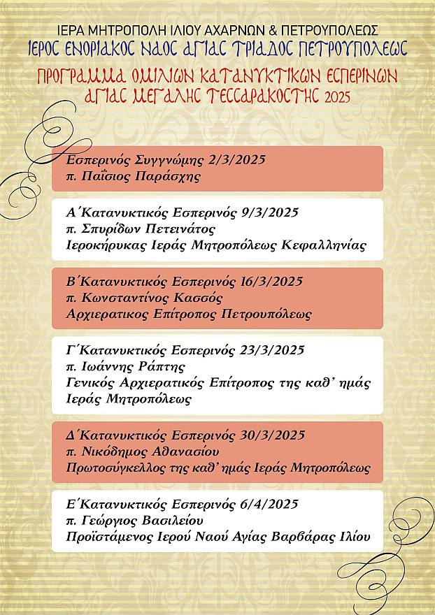 Πρόγραμμα ομιλιών κατανυκτικών Εσπερινών Αγίας Μεγάλης Τεσσαρακοστής 2025 στον Ιερό Ναό Αγίας Τριάδας Πετρουπόλεως.