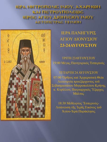 Πρόγραμμα πανηγύρεως Αγ. Διονυσίου Ιλίου