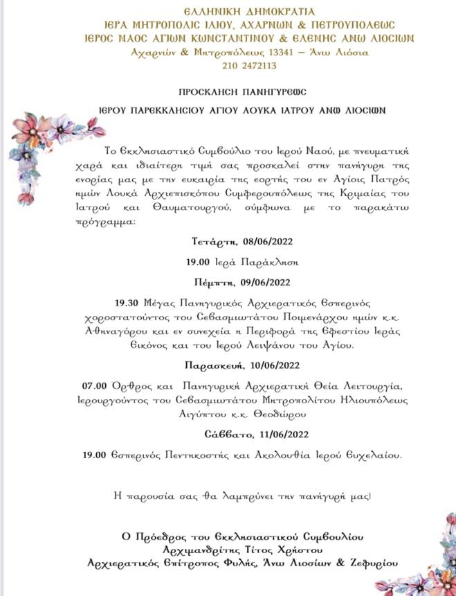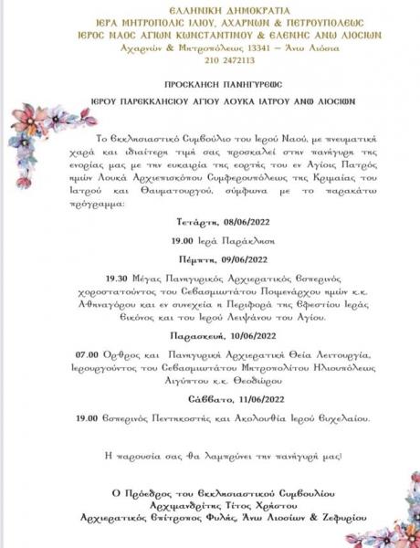 Το Εκκλησιαστικό Συμβούλιο του Ι.Ν. Αγίων Κωνσταντίνου και Ελένης Άνω Λιοσίων, με πνευματική χαρά και ιδιαίτερη τιμή σας προσκαλεί στην πανήγυρη του Παρεκκλησίου του εν Αγίοις Πατρός ημών Λουκά, Αρχιεπισκόπου Συμφερουπόλεως, του ιατρού και θαυματουργού, σύμφωνα με το παρακάτω πρόγραμμα: