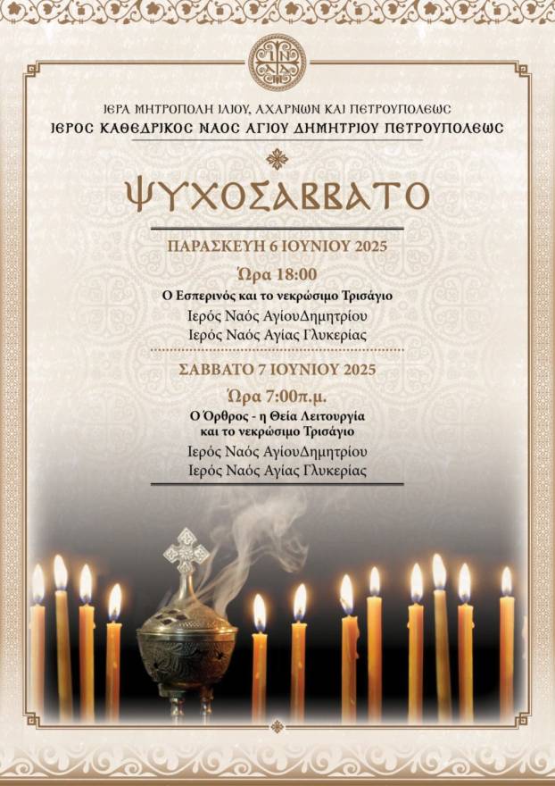 Πρόγραμμα Ψυχοσαββάτου στους Ιερούς Ναούς Αγίου Δημητρίου και Αγίας Γλυκερίας Πετρουπόλεως.