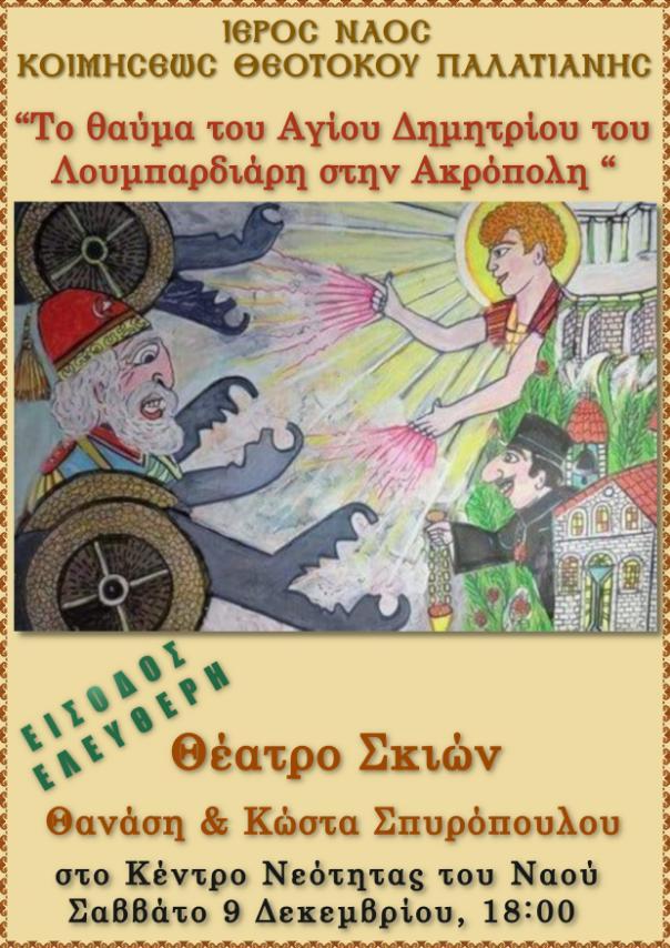 Την παράσταση με τίτλο «Το θαύμα του Αγίου Δημητρίου του Λουμπαρδιάρη στην Ακρόπολη» παρουσιάζει το θέατρο σκιών των Θανάση και Κώστα Σπυρόπουλου, στο κέντρο νεότητας του Ιερού Ναού Κοιμήσεως Θεοτόκου Παλατιανής Ιλίου, το Σάββατο 9 Δεκεμβρίου 2023, στις 18:00.