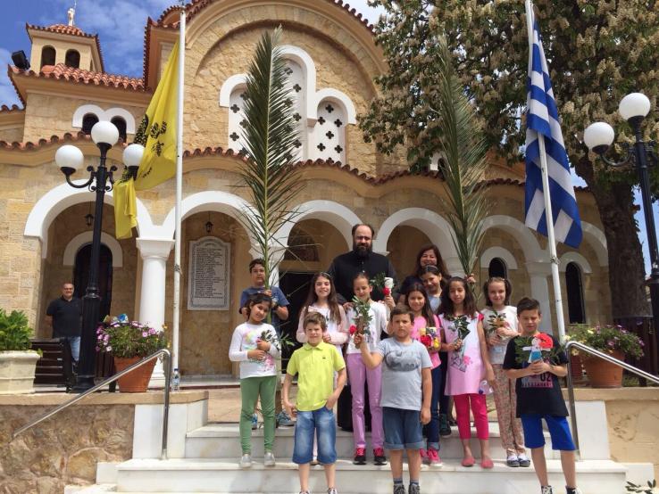 Τα παιδιά της ενορίας της Κοιμήσεως Θεοτόκου Αφιδνών ψάλουν μετά του προϊσταμένου π. Τιμοθέου Αναγνωστάκη, τα κάλαντα του Λαζάρου στο προαύλιο του ναού, ευχόμενα «Καλή Ανάσταση».