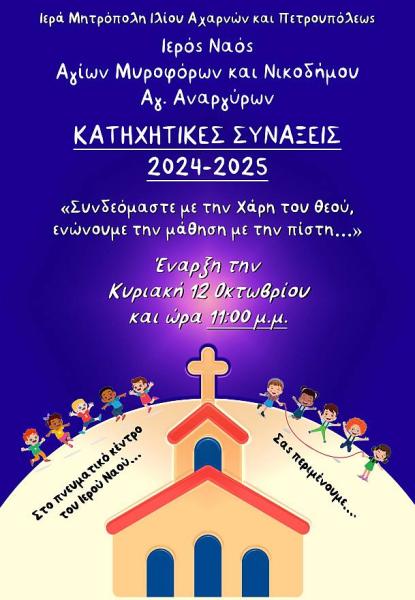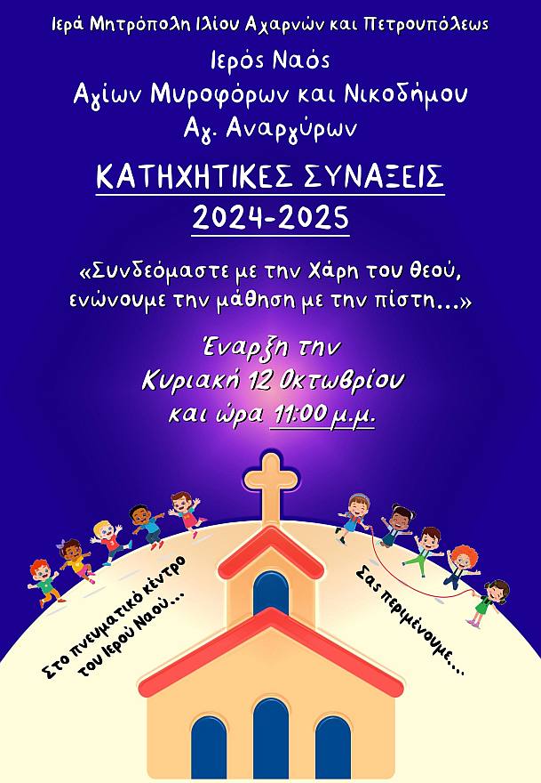 Αρχίζουν οι κατηχητικές συνάξεις της ενορίας των Αγίων Μυροφόρων και Νικοδήμου, την Κυριακή 12 Οκτωβρίου 2025, στις 11:00, στο πνευματικό κέντρο του ναού.