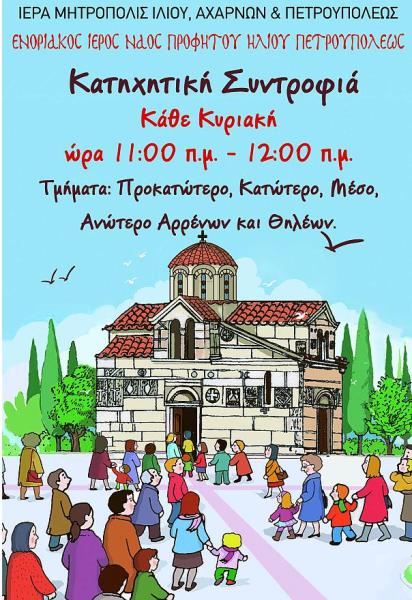 Ἡ Κατηχητικὴ Συντροφιὰ τῆς Ἐνορίας Προφήτου Ἠλιοῦ Πετρουπόλεως ἔχει ξεκινήσει, συναντιόμαστε κάθε Κυριακὴ ὥρα 11:00 μὲ 12:00, ὅλα τὰ παιδιά μας, ὅλων τῶν ἡλικιῶν, νὰ μιλήσουμε γιὰ Τὸν Χριστό, νὰ παίξουμε, νὰ τραγουδήσουμε καὶ νὰ διασκεδάσουμε μὲ διάφορα δρώμενα καὶ ἐκπλήξεις ποὺ θὰ ὑπάρχουν μέσα σ' αὐτὴ τὴν χρονιά.