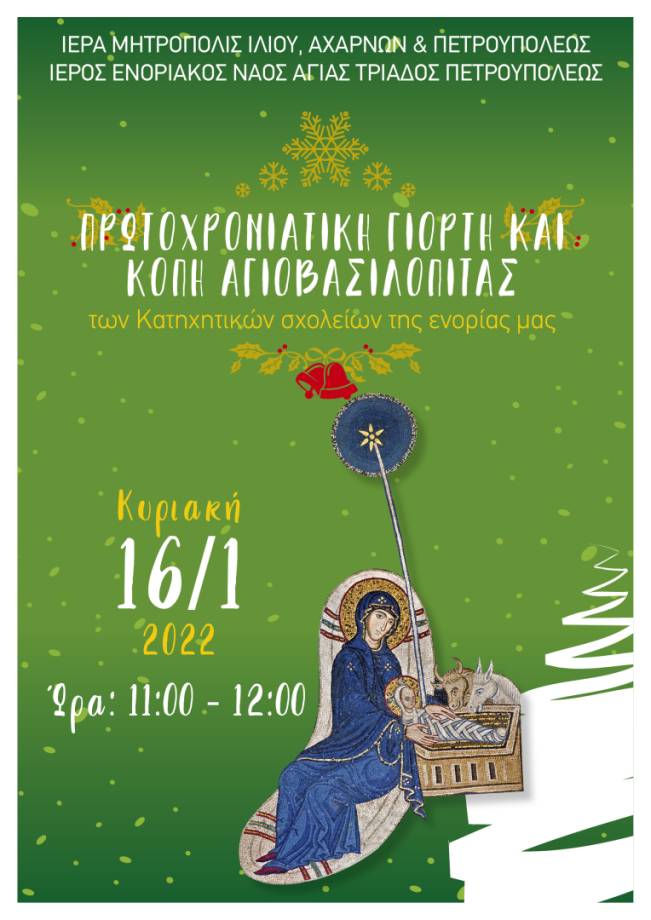 Την πρωτοχρονιάτικη γιορτή και την κοπή της αγιοβασιλόπιτας θα πραγματοποιήσουν οι κατηχητικές συνάξεις της ενορίας της Αγίας Τριάδας Πετρουπόλεως, την Κυριακή 16 Ιανουαρίου 2021, και από ώρας 11:00 έως 12:00.
