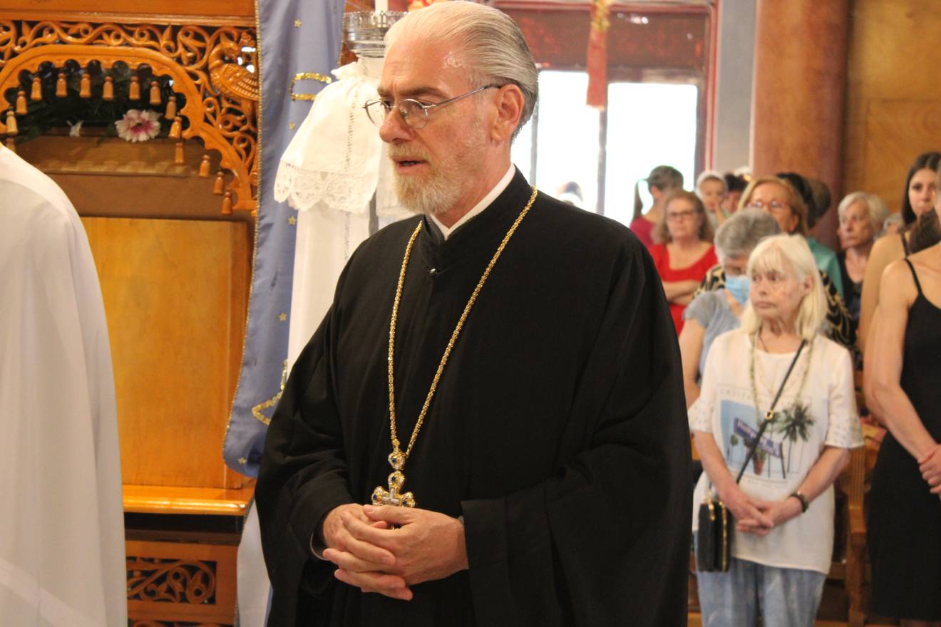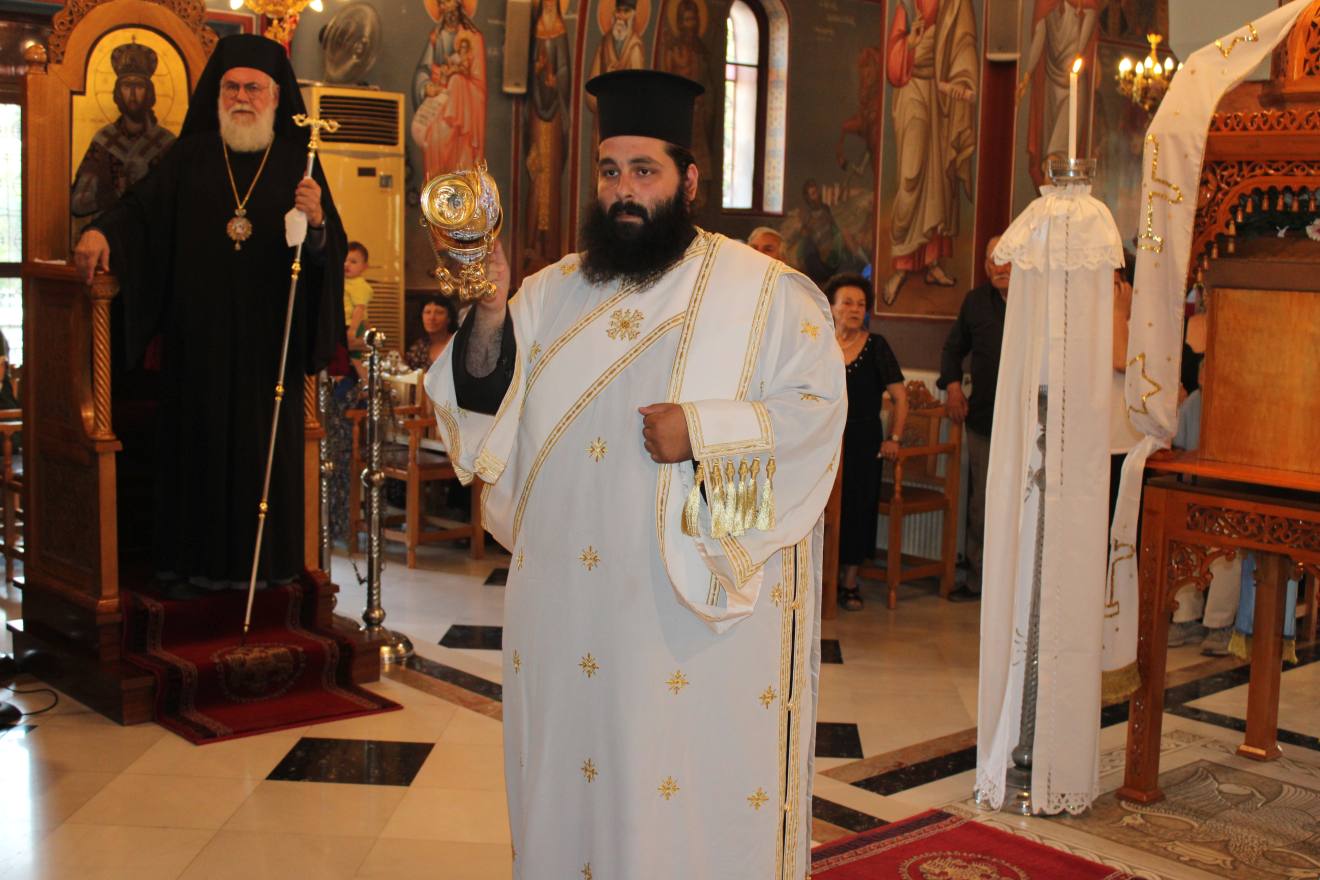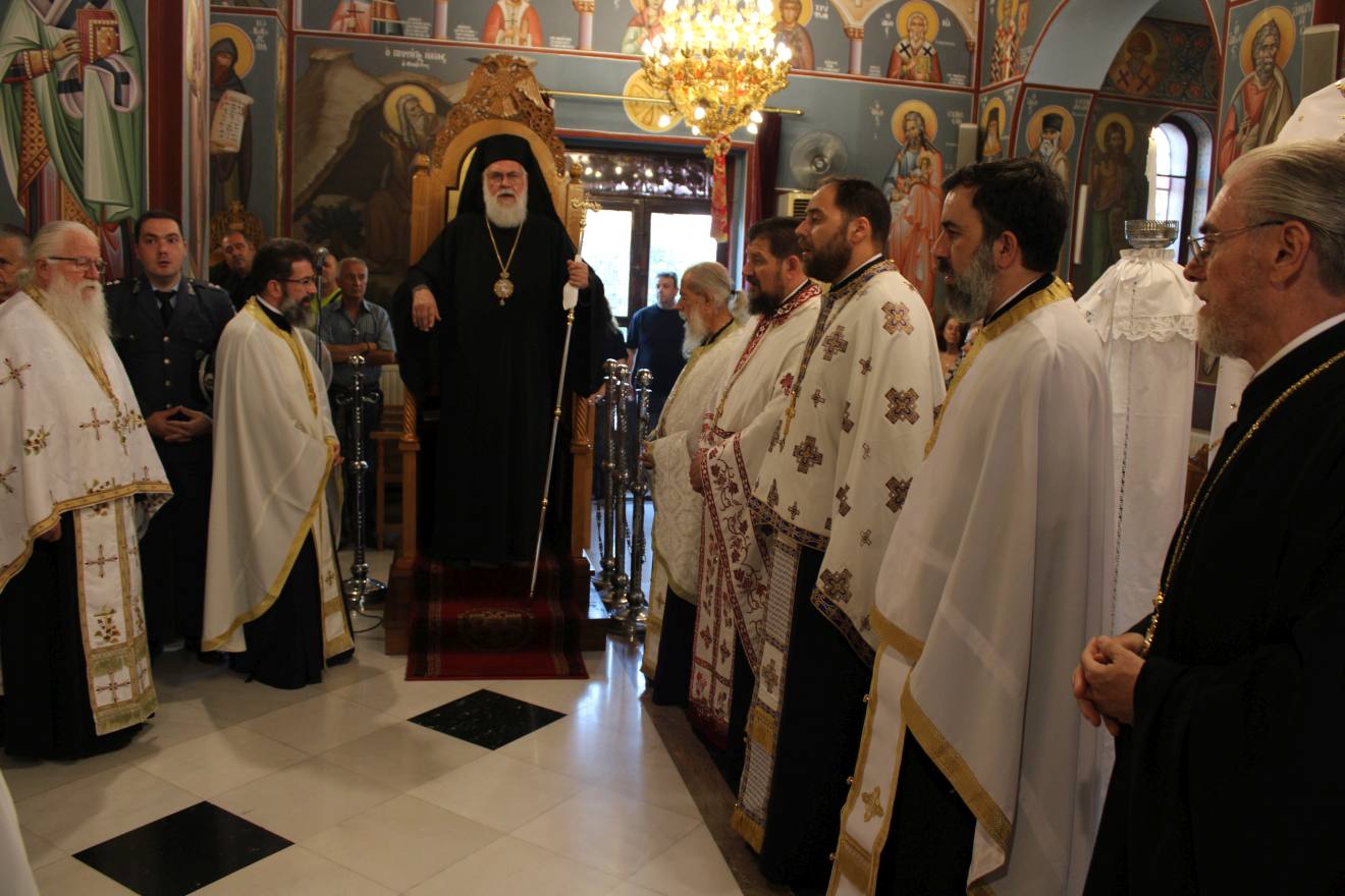 συμπαραστατούμενος από τους Αρχιμ. Ιωάννη Ράπτη - Γενικό Αρχιερατικό της Ιεράς Μητροπόλεως, π. Αναστάσιο Ξανθίδη - Πρόεδρο του Εκκλ. Συμβουλίου του Ιερού Ναού, π. Ελευθέριο Βάσσο - Πρόεδρο του Εκκλ. Συμβουλίου του Ιερού Ναού Αγίων Κωνσταντίνου και Ελένης Άνω Αχαρνών, π. Σταμάτη Καλημέρη - Πρόεδρο του Εκκλ. Συμβουλίου του Ιερού Ναού Αγίου Σπυρίδωνα Καματερού, π. Διονύσιο Λαμπρόπουλο - εφημέριο Ιερού Ναού Αγίου Δημητρίου Πετρουπόλεως, ομόρους ιερείς και τον διάκονό του π. Άγγελο Μιχαλόπουλο.