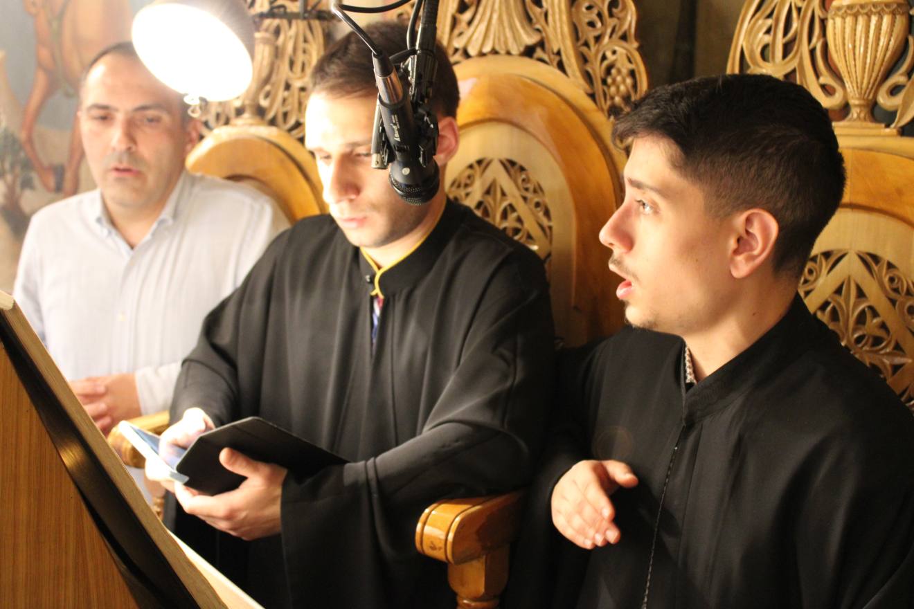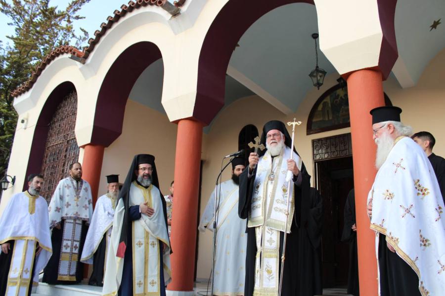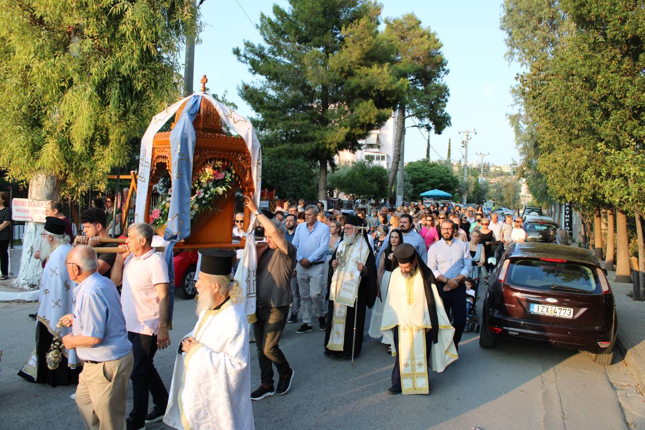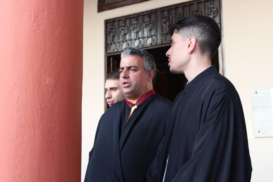συμπαραστατούμενος από τους Αρχιμ. Ιωάννη Ράπτη - Γενικό Αρχιερατικό της Ιεράς Μητροπόλεως, π. Αναστάσιο Ξανθίδη - Πρόεδρο του Εκκλ. Συμβουλίου του Ιερού Ναού, π. Ελευθέριο Βάσσο - Πρόεδρο του Εκκλ. Συμβουλίου του Ιερού Ναού Αγίων Κωνσταντίνου και Ελένης Άνω Αχαρνών, π. Σταμάτη Καλημέρη - Πρόεδρο του Εκκλ. Συμβουλίου του Ιερού Ναού Αγίου Σπυρίδωνα Καματερού, π. Διονύσιο Λαμπρόπουλο - εφημέριο Ιερού Ναού Αγίου Δημητρίου Πετρουπόλεως, ομόρους ιερείς και τον διάκονό του π. Άγγελο Μιχαλόπουλο.